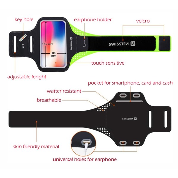 Púzdro SWISSTEN ARMBAND je vybavené výstupom na slúchadlá. Vďaka tomu môžete počas športových aktivít počúvať svoju obľúbenú hudbu.