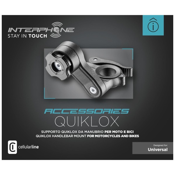 Držiak Interphone QUIKLOX s novým rýchloupínacím systémom, ktorý vám umožní mať mobilný telefón neustále pri sebe. Ide o univerzálny držiak vhodný pre rúrkové riadidlá, prispôsobí sa rôznym priemerom. Hlava držiaka je vybavená špeciálnym systémom QUIKLOX. Ten funguje v spolupráci s lepiacou základňou SMQUIKLOXPAD, ktorá sa inštaluje na zadnú stranu telefónu. Po pripevnení k držiaku stačí telefón otočiť, aby bol pevne pripevnený k držiaku. Rovnako rýchlo potom môžete telefón odpojiť, keď skončíte s jazdou. Uhol ramena držiaka si môžete nastaviť podľa svojich potrieb.