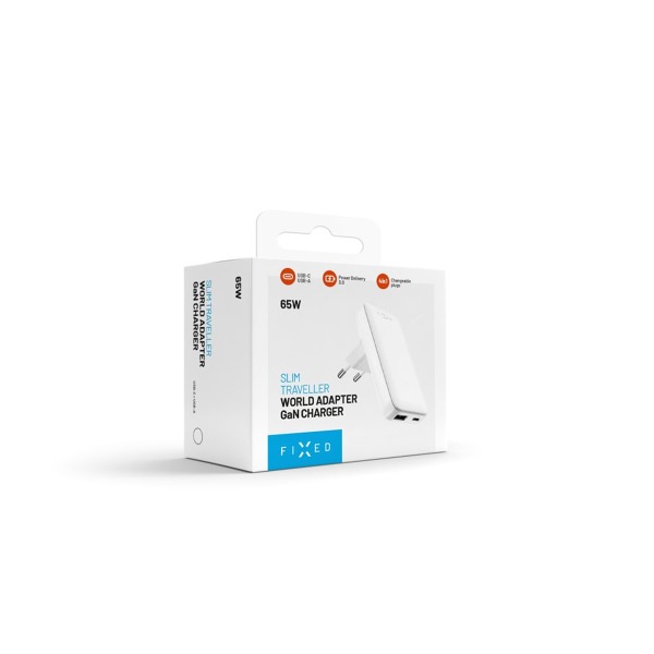 Sieťová nabíjačka FIXED Slim Traveller GaN s výstupom USB-C a USB s vymeniteľnými adaptérmi, 65 W, biela