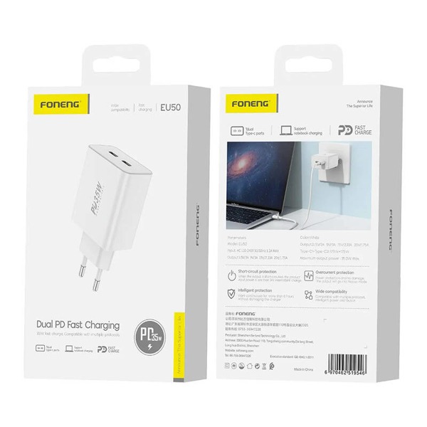 Sieťová nabíjačka Foneng EU50, PD35W 2x USB-C (biela)