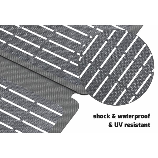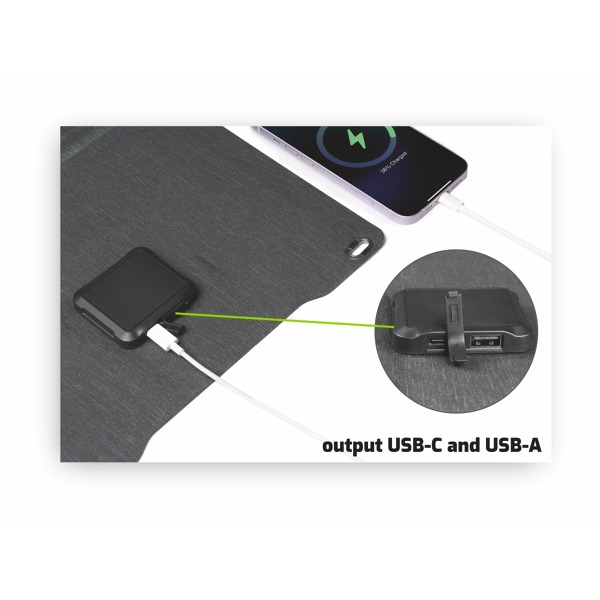 Panel je ľahký, ľahko prenosný a prenosný vďaka svojej skladacej konštrukcii. Je vyrobený z odolného materiálu ETFE, ktorý zaručuje dlhú životnosť a vysokú účinnosť aj v náročných podmienkach. Vďaka praktickým výstupom USB-C a USB-A môže nabíjať viacero zariadení naraz.