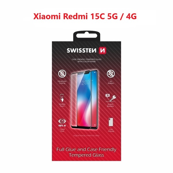 SKLO SWISSTEN FULL GLUE, COLOR FRAME, CASE FRIENDLY PRO XIAOMI REDMI 15C 4G ČERNÉ