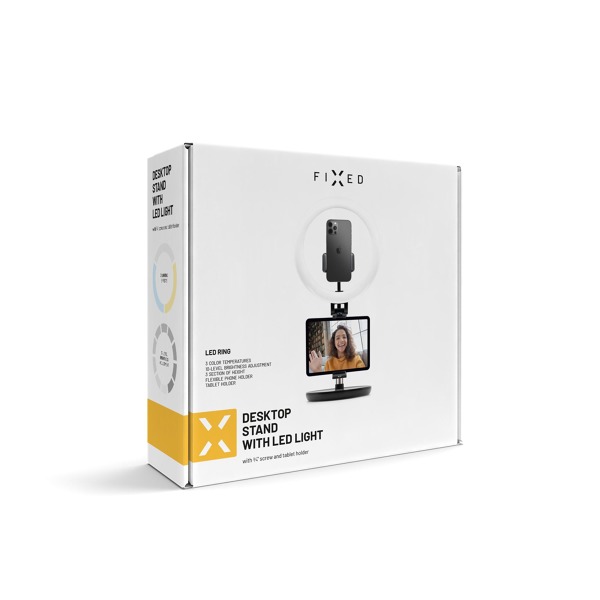 Všestranný statív FIXED LEDRing s kruhovým svetlom je profesionálne príslušenstvo na natáčanie videa, streamovanie a fotografovanie. Spolu s telefónom, tabletom, fotoaparátom alebo akčnou kamerou vytvorí statív malé natáčacie štúdio priamo u vás doma. Hlavnou výhodou statívu je svetelný kruh so 120 LED diódami a nastaviteľným sklonom. V napájacom kábli USB sa nachádza diaľkové ovládanie s tromi teplotnými režimami a desiatimi úrovňami jasu na nastavenie dokonalého osvetlenia. Kliešte na telefón so šírkou 5 - 8,8 cm a flexibilným ramenom sa nachádzajú priamo v strede svetelného prstenca. Väčší odnímateľný držiak so šírkou 5 - 24 cm na tablet aj telefón sa nachádza na teleskopickej nohe statívu, jeho nastaviteľné kliešte si poradia so všetkými veľkosťami rôznych zariadení. Treťou možnosťou montáže je dokovacia stanica na upevnenie pomocou 1/4" skrutky v spodnej časti svetelného kruhu vhodná pre externé mikrofóny alebo akčné kamery. Široké možnosti použitia pre rôzne zariadenia a dokonalé osvetlenie robia zo statívu FIXED LEDRing ideálny nástroj pre všetkých nadšených tvorcov multimediálneho obsahu pre sociálne médiá aj inde.