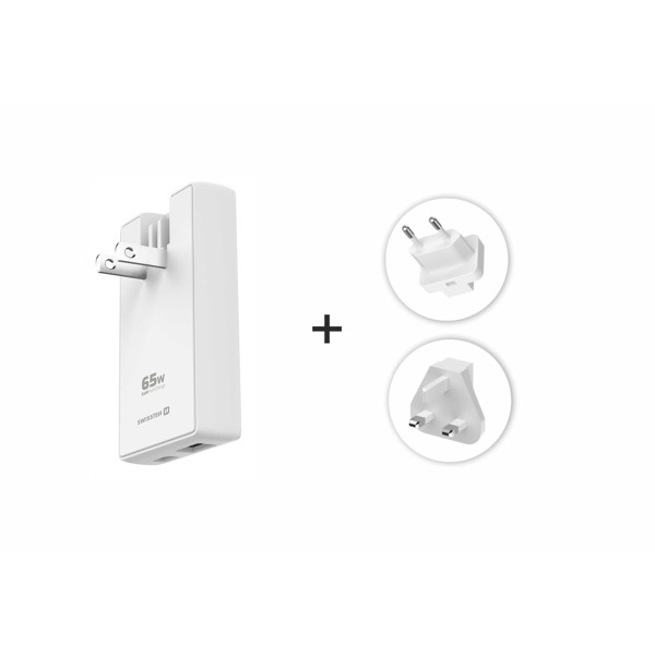 SWISSTEN CESTOVNÝ ADAPTÉR GaN USB-C + USB-A 65W VYMENITEĽNÉ PRÍSLUŠENSTVO (US, EU, UK) BIELA