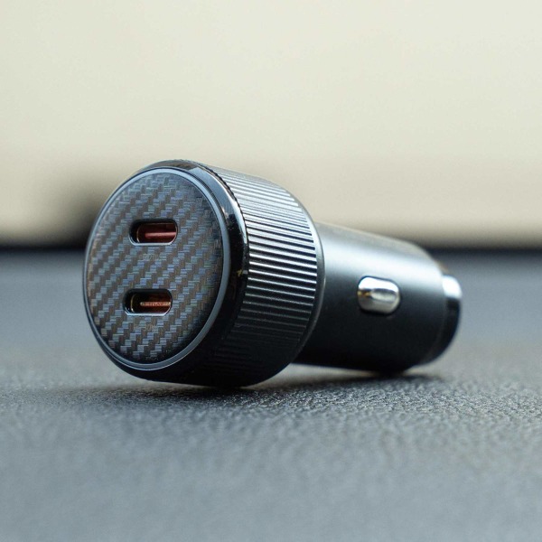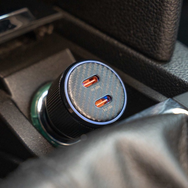 Kompaktná a výkonná nabíjačka do auta s dvoma portami USB-C a podporou PD 3.0. Modré LED podsvietenie uľahčuje pripojenie kábla aj pri jazde v noci.