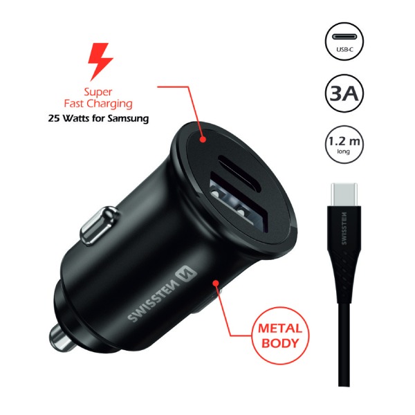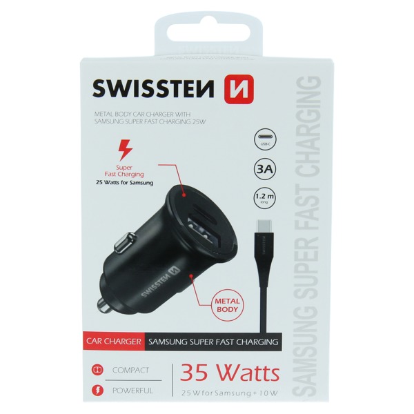 Krytoland pouzdra a kryty na mobil > Príslušenstvo pre automobily > Nabíjačky do auta > SWISSTEN CL PRE SAMSUNG SUPER RÝCHLE NABÍJANIE 25W + KÁBEL USB-C/USB-C 1,2 M ČIERNY