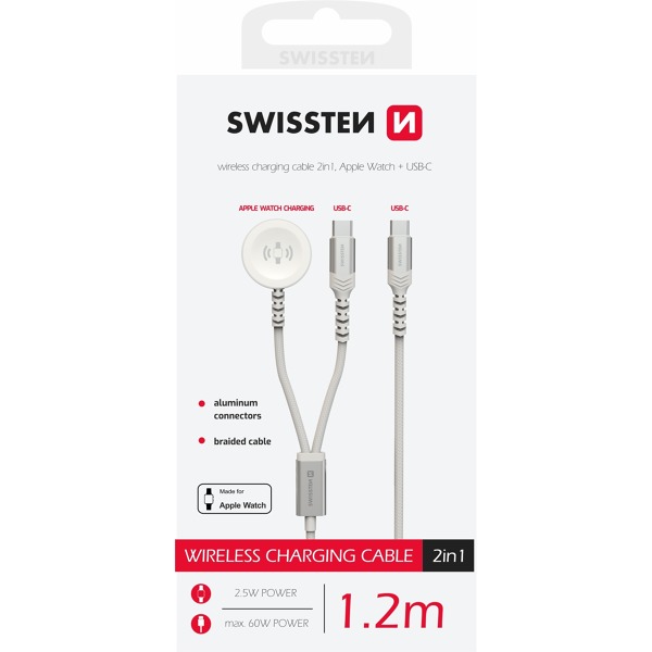 SWISSTEN KOVOVÝ KÁBEL 2v1 PRE APPLE WATCH A USB-C, USB-C 1,2 M WHITE