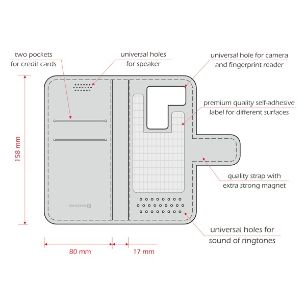 Pevný kvalitný univerzálny obal na knihy vyrobený z vysokokvalitných materiálov. Telefón je pripevnený pomocou samolepiacej 3M pásky a zabezpečený magnetickým prúžkom proti otvoreniu puzdra. Puzdro má otvory pre reproduktor, pre možnosť telefonovania so zatvoreným puzdrom, pre fotoaparát a čítačku odtlačkov prstov. Vo vnútri puzdra sa nachádzajú dve vrecká na kreditné karty. Vhodné pre väčšinu telefónov s dotykovým displejom s rozmermi do 158 × 80 mm Balené v blistri SWISSTEN