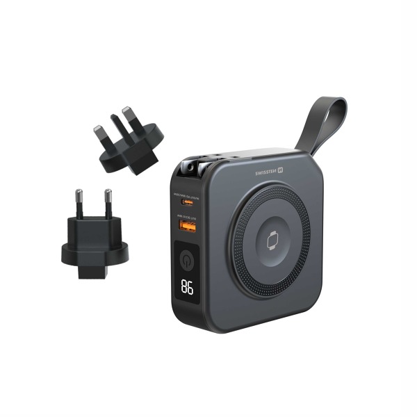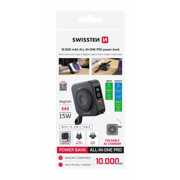 Power banka Swissten All-in-One Pro je ideálnym riešením na cesty s integrovanou sieťovou nabíjačkou, viacerými výstupmi a bezdrôtovými nabíjacími podložkami. S kapacitou 10 000 mAh a zabudovaným káblom USB-C ponúka rýchle a spoľahlivé nabíjanie telefónu, tabletu, slúchadiel TWS a hodiniek Apple Watch - doma aj v zahraničí. Powerbank je nielen kompaktný zdroj energie, ale aj univerzálna cestovná nabíjačka, vďaka ktorej nemusíte nosiť so sebou viacero adaptérov a káblov.