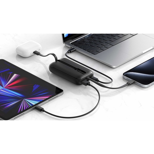 Zabudované káble USB-C a Lightning poskytujú maximálnu flexibilitu a pohodlie, vďaka čomu môžete nabíjať zariadenia s Androidom aj iOS bez potreby ďalšieho príslušenstva. Nechýba ani USB-A port s výkonom až 22,5 W pre nabíjanie ďalších zariadení.