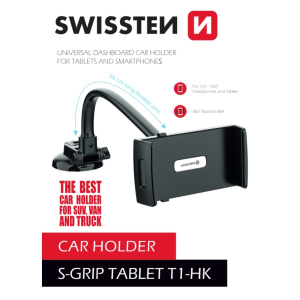 Držiak tabletu do auta SWISSTEN S-GRIP T1-HK je určený na inštaláciu na čelné sklo alebo palubnú dosku. Čeľuste držiaka majú rozpätie až 165 mm. Jeho dĺžka husieho krku je 36 cm. Balené v blistrovom balení Swissten.