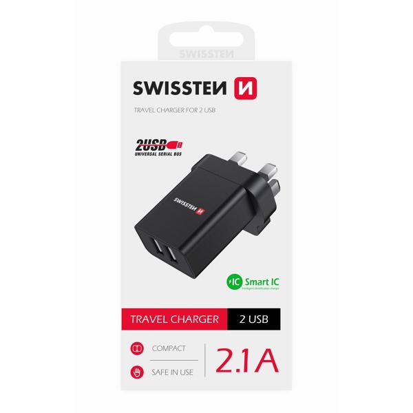 Kvalitná nabíjačka s výstupným prúdom 2,1 A , technológiou Smart IC, dvoma výstupmi USB a vidlicou pre zásuvky UK. Balené v blistri SWISSTEN.