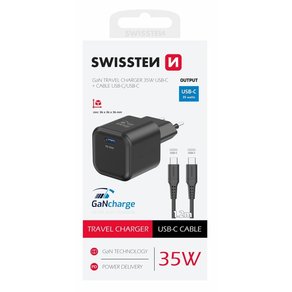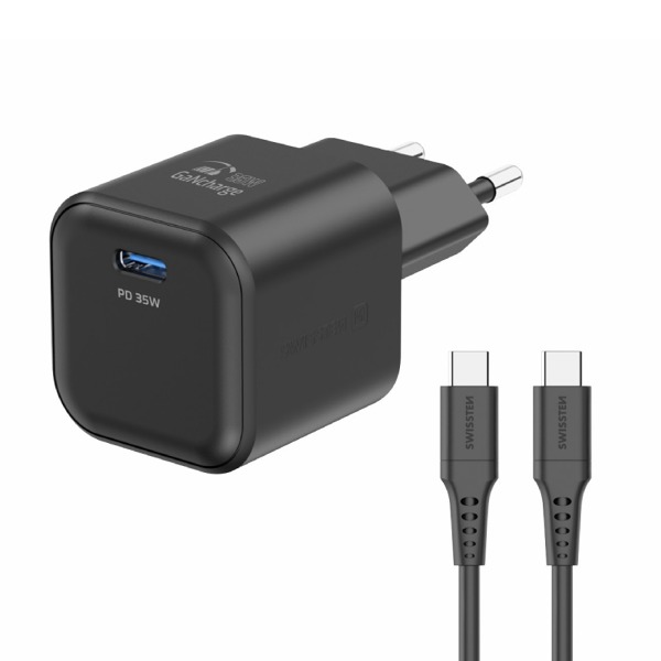 SWISSTEN SIEŤOVÝ ADAPTÉR GaN 1x USB-C 35W NAPÁJANIE ČIERNY + DÁTOVÝ KÁBEL USB-C/USB-C 1,2 M ČIERNY