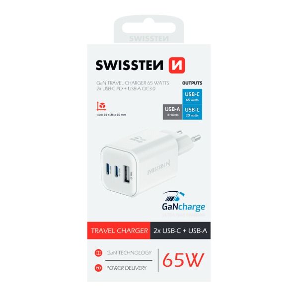 SWISSTEN SIEŤOVÝ ADAPTÉR GaN 2x USB-C 65W PD + 1x USB-A 18W QC BIELA