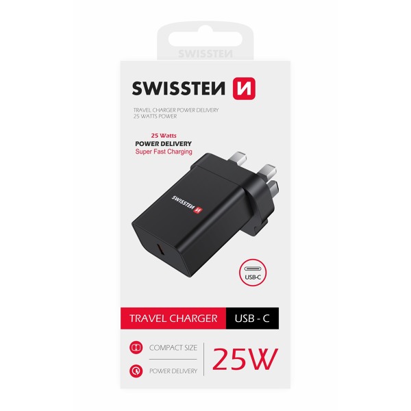 Nabíjačka má výstupný port USB-C s technológiou Powerdelivery pre Apple aj Super rýchle nabíjanie pre Samsung, vidlicu pre britské zásuvky a výstupný výkon 25 W. Balené v blistri SWISSTEN.