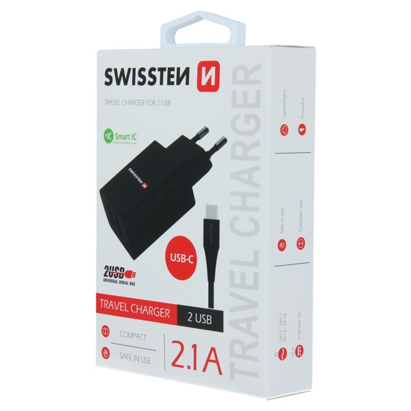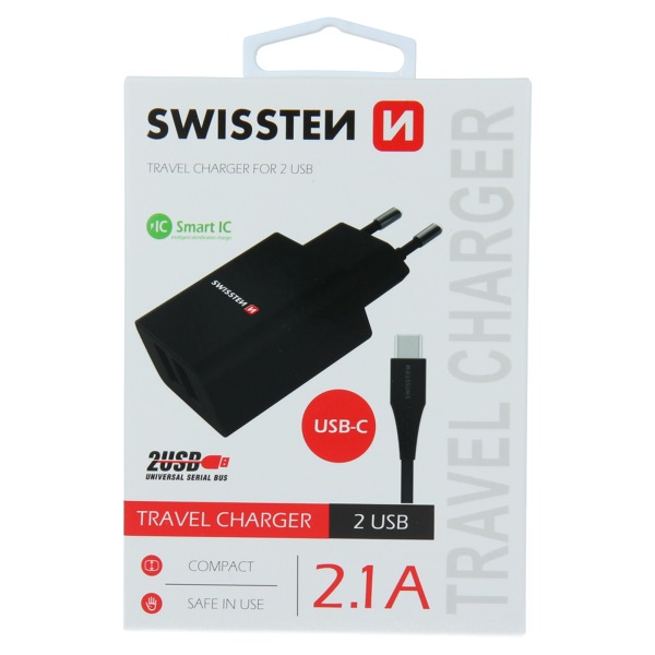Krytoland pouzdra a kryty na mobil > Príslušenstvo pre mobilné telefóny > Nabíjanie > Kompletné nabíjačky > Nabíjačky USB-C > SWISSTEN SIEŤOVÝ ADAPTÉR SMART IC 2x USB 2,1A NAPÁJACÍ + DÁTOVÝ KÁBEL USB / TYP C 1,2 M ČIERNY