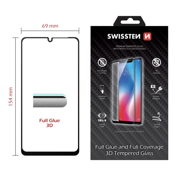 Premiové tvrdené sklo SWISSTEN 3D FULL GLUE ponúka maximálnu ochranu displeja vášho smartfónu. Vyznačuje sa vysokou citlivosťou na dotyk, jednoduchou inštaláciou, ochranou až po okraj displeja a 98% priehľadnosťou. Oleofóbna úprava skla zabraňuje vzniku odtlačkov prstov. Balené v blistri SWISSTEN.