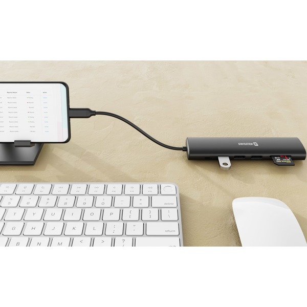 Hľadáte všestranný a kompaktný rozbočovač, ktorý rozšíri využitie vášho notebooku alebo iného zariadenia? Našli ste ten správny! Rozbočovač Swissten USB-C 7 v 1 má elegantný dizajn a je vybavený portom USB-C so 100 W nabíjacím výkonom, portom HDMI na výstup videa v rozlíšení 4K, 1 portom USB-A 3.0, 2 portami USB-A 2.0 a slotmi na karty SD a Micro SD.