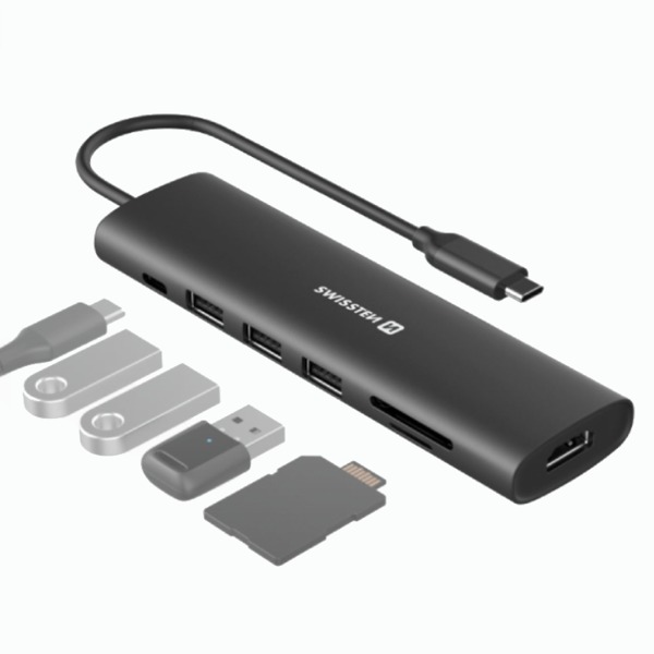 SWISSTEN USB-C HUB 7-IN-1 (USB-C 100W, HDMI 4K, 1x USB-A 3.0, 2x USB-A 2.0, SD, MICRO SD) HLINÍK
