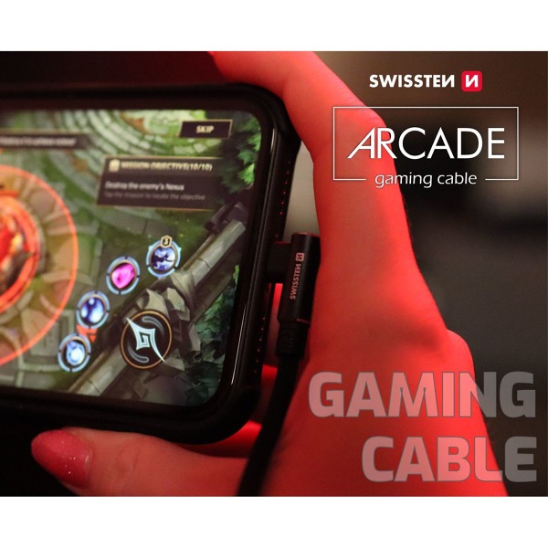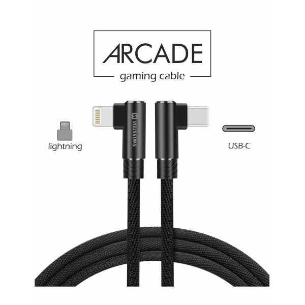 Dátový a nabíjací kábel Swissten Arcade je dlhý 1,2 m a má konektor L na pohodlné nabíjanie počas hrania hier alebo sledovania videí. Kábel je zosilnený, aby mohol prenášať väčší prúd (až 3 A), a zvládne aj rýchly prenos dát rýchlosťou 480 Mb/s. Balený v blistrovom balení Swissten