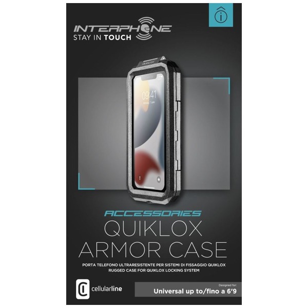 QUIKLOX Armor je mimoriadne odolné vodotesné puzdro na smartfón do veľkosti 6,9" určené na pripevnenie na motocykel alebo bicykel pomocou rýchloupínacieho systému Interphone QUIKLOX. Je kompatibilné s rôznymi držiakmi a úchytmi QUIKLOX, ako aj s modulom na zníženie vibrácií, ktorý poskytuje dodatočnú ochranu. Puzdro je vyrobené z tvrdeného plastu s vnútorným silikónovým polstrovaním pre úplnú ochranu vloženého telefónu aj počas extrémnych podmienok. Bezpečne chráni pred všetkými nárazmi, prachom, dažďom a snehom počas jazdy. Priehľadné predné okno puzdra je vyrobené zo špeciálnej fólie, ktorá chráni displej a zároveň umožňuje naplno využívať všetky funkcie dotykového displeja. Vďaka prístupu k nabíjaciemu konektoru môžete telefón v puzdre pohodlne nabíjať počas jazdy.