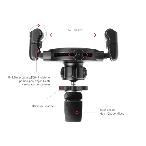 - jedinečný rolovací systém na upevnenie telefónu pomocou posuvných klieští