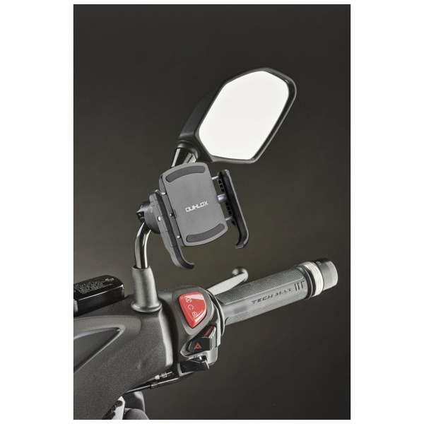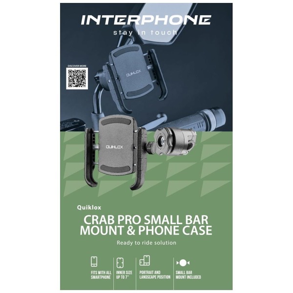 Univerzálny držiak Interphone Crab QUIKLOX určený na pripevnenie na zrkadlo motocykla vám umožní mať mobilný telefón počas jazdy pohodlne a bezpečne po ruke. Spája výhody tvrdenej hliníkovej konštrukcie, štýlového dizajnu a praktického výkonu. Kliešte držiaka sú pokryté silikónovým polstrovaním a bezpečne upevnia akýkoľvek mobilný telefón so šírkou 6 - 9 cm, ktorý sa nepohne ani pri najmenších otrasoch spôsobených jazdou. Držiak je vybavený rýchloupínacím systémom QUIKLOX, na jeho pevné upevnenie stačí jednoduché pootočenie. Po skončení jazdy môžete telefón rovnako rýchlo odpojiť. Inštalácia je jednoduchá, pomocou voliteľných výplní prispôsobíte priemer držiaka danému priemeru zrkadla.