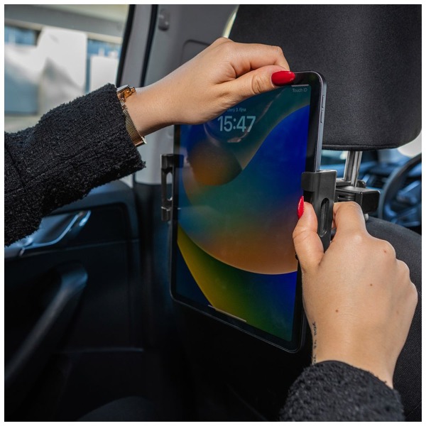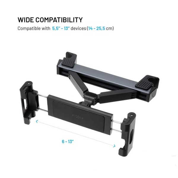 Fixed Passenger Max je plne nastaviteľný držiak na tablet s uchytením na opierku hlavy, ktorý sa okamžite stane obľúbeným spoločníkom cestujúcich na zadných sedadlách, aby sa zbavili stresu z jazdy autom. Držiak sa ľahko inštaluje pomocou pružinových klieští, ktoré sa zacvaknú na šírku konkrétnej opierky hlavy, čím sa zabráni vypadnutiu držiaka. Umiestnenie samotného tabletu je veľmi jednoduché, bočné kliešte sa prispôsobia vloženému zariadeniu a zabezpečia stabilitu. Zároveň sú dostatočne veľké na to, aby bezpečne udržali iPad 12,9 Pro alebo tablety iných výrobcov so šírkou až 25,5 cm. Na dosiahnutie ideálneho pozorovacieho uhla možno tablet v držiaku nastaviť do ľubovoľnej polohy pomocou otočného kĺbu a jeho vzdialenosť od čelnej strany možno upraviť pomocou výsuvného ramena s dĺžkou až 6,5 cm. Telo držiaka FIXED Passenger Max je vyrobené v kombinácii hliníka, tvrdeného plastu a presne opracovaných kĺbov, ktoré odolávajú všetkým nárazom spôsobeným jazdou. Je tiež vybavené výrezmi pre prístup k nabíjacím konektorom a silikónovým polstrovaním, ktoré zabraňuje poškodeniu zariadenia. Keď sa držiak nepoužíva, bočné úchyty sa dajú sklopiť, aby sa ušetrilo miesto. S držiakom FIXED Passenger Max sa každá cesta autom stane udalosťou plnou zábavy.