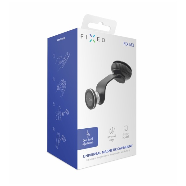 FIXED FIXM3 je praktický doplnok na pripevnenie mobilného telefónu v aute. Na stabilné pripevnenie k čelnému sklu slúži vysoko priľnavá prísavka na základni držiaka. Vďaka svojmu štýlovému vzhľadu dokonale doplní interiér každého vozidla. Magnetické pripevnenie telefónu k držiaku zabezpečuje kovový lepiaci čip, ktorý možno jednoducho nalepiť na zadnú stranu alebo kryt telefónu, alebo kovová doštička, ktorú možno vložiť medzi telefón a kryt. Držiak telefónu je pevný a stabilný, odoláva všetkým nárazom spôsobeným jazdou. Okrúhly kĺb držiaka umožňuje nastaviť telefón do ľubovoľného uhla.