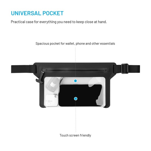 Vodotesné puzdro FIXED Dry Belt s upevnením na opasok je skvelou voľbou pre outdoorových nadšencov, milovníkov prírody a návštevníkov festivalov a koncertov, ktorí vyžadujú priehľadné tašky na rýchlu kontrolu obsahu. Priestranné vnútorné vrecko pojme všetky potrebné veci vrátane telefónov s uhlopriečkou až 7,5", takže budete mať všetko dôležité vždy po ruke. Priehľadné strany tiež umožňujú dotýkať sa telefónu priamo vo vnútri puzdra, vrátane funkcie Face ID. Puzdro je vyrobené z extrémne odolného materiálu Hypalon mesh 420D, ktorý poskytuje maximálnu ochranu proti vode, oderu alebo roztrhnutiu, čím predlžuje životnosť puzdra aj pri intenzívnom používaní. Bezpečné uzatváranie zabezpečuje vodotesný zips, ktorý stačí pevne utiahnuť a puzdro sa okamžite uzavrie. Vďaka certifikácii IPX8 ochráni váš obsah aj pri ponorení do hĺbky 5 metrov až na jednu hodinu. Pre pohodlné nosenie je puzdro vybavené nastaviteľným popruhom s maximálnou dĺžkou 127 cm, ktorý si môžete ľahko prispôsobiť podľa svojich potrieb.