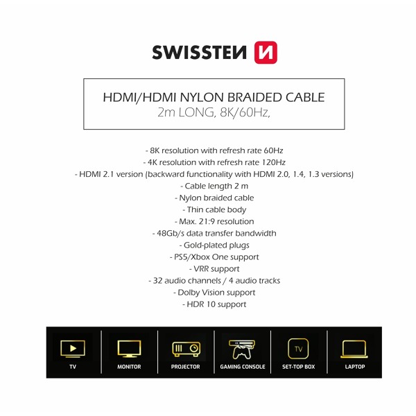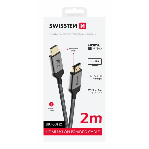 Hľadáte kvalitný opletený kábel HDMI, ktorý poskytuje vynikajúce rozlíšenie obrazu 8K? Našli ste ten správny. S naším káblom HDMI Swissten s verziou 2.1 si vychutnáte obraz na vysokej úrovni a vďaka technológii Dolby Atmos aj dokonalý zvuk. Kábel HDMI podporuje 4 zvukové stopy a 32 zvukových kanálov. Vďaka použitým materiálom a nespočetným funkciám kábel splní požiadavky prakticky každého zákazníka. Medzi ne patria VRR, HDR10, HDR10+, QMS a ďalšie. Maximálna priepustnosť kábla je 48 Gb/s.