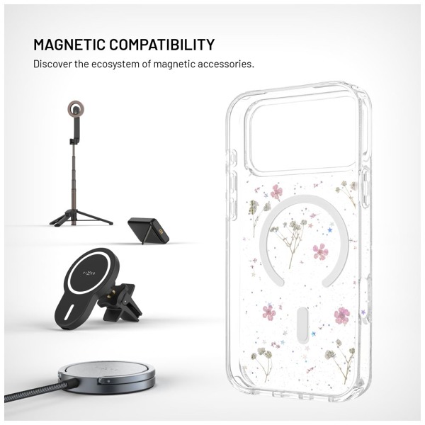 Ochranný kryt FIXED MagBloom premení váš telefón na štýlový a zároveň praktický doplnok, ktorý poskytuje spoľahlivú ochranu pri každodennom používaní. Zadná strana z tvrdeného polykarbonátu chráni pred poškriabaním, zatiaľ čo pružné strany z TPU absorbujú nárazy a pády. Najviac však upúta originálny dizajn - priamo do zadnej strany sú vtlačené skutočné sušené kvety, ktoré si zachovávajú svoj prirodzený tvar a farbu. Vďaka tomu je každý kryt originálom. Priehľadný materiál zároveň prirodzene odoláva žltnutiu a mierne vyvýšené okraje v oblasti fotoaparátu a displeja ich chránia pred kontaktom s povrchom a prípadným poškriabaním. Magnety MagSafe sú navyše vytvarované priamo do tela krytu, takže nevyčnievajú a nehrozí ich vypadnutie. Spoľahlivo sa pripevnia k nabíjačkám a inému magnetickému príslušenstvu. S každým zariadením FIXED MagBloom získate originálny kvetinový vzhľad spolu so spoľahlivou celkovou ochranou.