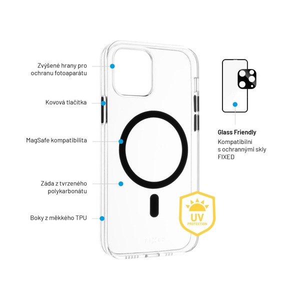 FIXED MagPurity s podporou MagSafe je tvrdený priehľadný kryt, ktorý spoľahlivo ochráni váš iPhone a nechá vyniknúť jeho originálny dizajn. Kryt je vyrobený z kombinácie tvrdeného polykarbonátu a mäkkého TPU, ľahko sa nasadzuje a dokonale kombinuje ochranu pred nárazmi, pádmi a poškriabaním. Vďaka integrovaným magnetom kryt dokonale spolupracuje so všetkým príslušenstvom MagSafe. Bezdrôtové nabíjanie je tak jednoduchšie a efektívnejšie ako kedykoľvek predtým, stačí nabíjačku MagSafe prichytiť priamo ku krytu. Úplne priehľadný dizajn krytu FIXED MagPurity dopĺňajú čierne detaily v podobe kovových krytov ovládacích tlačidiel a krúžku MagSafe na zadnej strane krytu. Mierne prekrývajúce sa okraje krytu chránia displej telefónu a objektív fotoaparátu pred poškriabaním, napríklad pri položení na stôl.